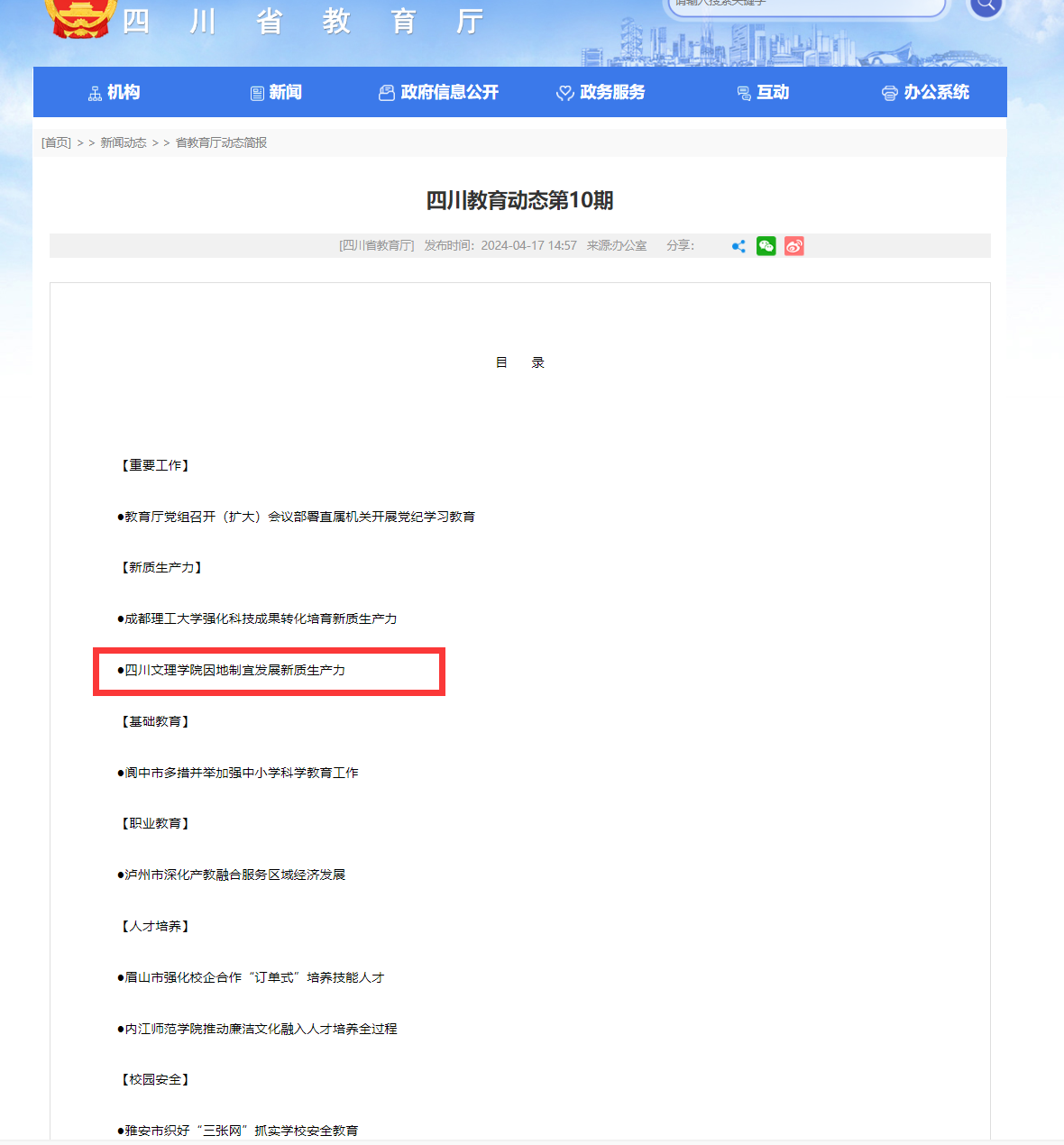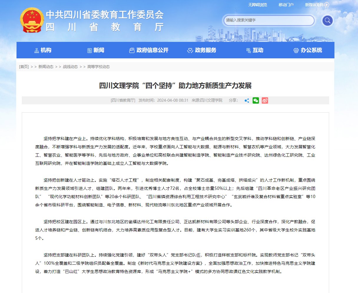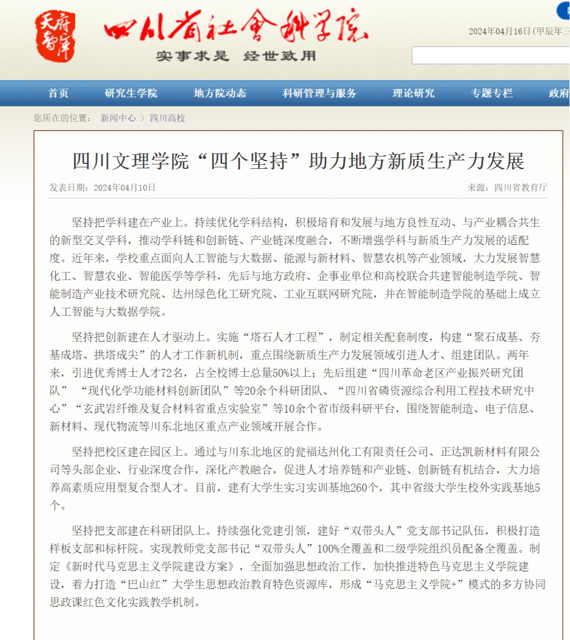 四川省教育厅和四川省社会科学院网站刊载我校助力地方新质生产力发展举措的文章:《yl23455永利集团官网“四个坚持”助力地方新质生产力发展》。