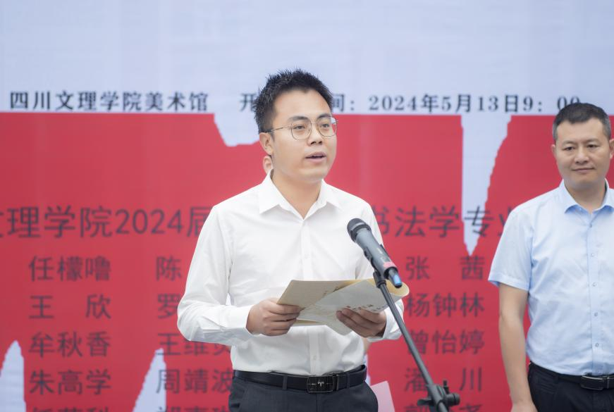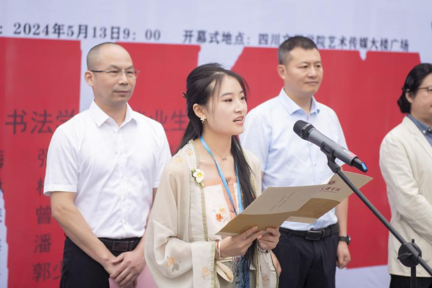 中国书协草书专业委员会委员、四川省书协第六届副主席、四川省书协行草书委员会主任何开鑫先生作为嘉宾代表发言,他回顾了与我校书法学专业结下的深厚情谊,勉励同学们涵养“三种精神”,培育“三种能力”,在书法学习路上踔厉奋发,再创佳绩。2024届毕业创作指导教师代表、带班班主任陆峰老师在发言中深情追忆了同学们四年来的蜕变,并以苏轼的“自言其中有至乐,适意无异逍遥游”激励同学们坚守初心,保持对书法的持久热爱,不断充实自己,谱写人生华美篇章。2024届书法学专业毕业生代表王维贞回忆了自己四年学书的心路历程,表示要将毕业作为新的起点,学贵有恒,学需崇实,在书学道路上一直向前。