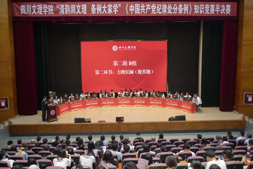 为深入学习贯彻习近平新时代中国特色社会主义思想,扎实开展好党纪学习教育,强化全校党员党纪党规学习,5月29日,校纪委办公室与党委宣传部联合举办了主题为“清韵润文理,条例大家学”的《中国共产党纪律处分条例》知识竞赛(半决赛)。来自十六个二级学院党委、机关党委、后勤&离退休&图书馆三个党总支共组成的18支队伍,54名参赛人员参赛。比赛特别邀请了政法学院/知识产权学院党委书记岳臣忠、副书记刘良训和徐寅智博士组成专家组答疑组,设立计分组,保证比赛的公平与公正。