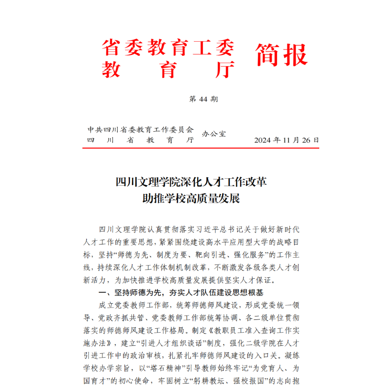 11月26日,省委教育工委 教育厅《简报》第44期以《yl23455永利集团官网深化人才工作改革助推学校高质量发展》为题,对我校进行了报道,系统介绍学校人才工作改革的经验做法及成效。