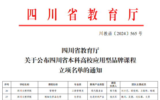 近日,四川省教育厅发布《四川省教育厅关于公布四川省本科高校应用型品牌课程立项名单的通知》(川教函〔2024〕565 号),我校《管理学》《精细化学品化学》成功获批立项省级应用型品牌课程。