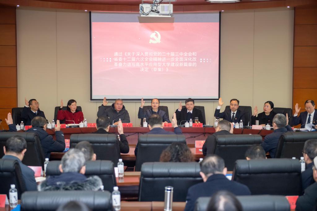 全会指出,党的二十届三中全会和省委十二届六次全会对深化教育综合改革、统筹推进教育科技人才体制机制一体改革作出重要部署,为新征程上推动全面深化改革提供了根本遵循,指明了前进方向。当前和今后一个时期是学校聚力申硕攻坚、奋力实现从第二次创业向第三次创业迈进、全面建设高水平应用型大学的关键时期,推动学校高质量发展仍面临诸多问题和挑战。全校上下必须深刻领悟“两个确立”的决定性意义,切实增强“四个意识”、坚定“四个自信”、做到“两个维护”,坚定不移推动中央和省委关于进一步全面深化改革的决策部署在学校落地落实。