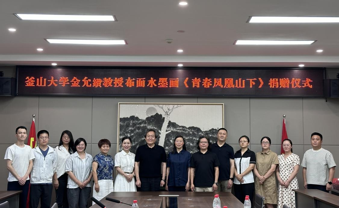 6月23日,韩国著名艺术家、韩国国立釜山大学博士生导师金允鑽教授力作布面水墨画《青春凤凰山下》捐赠仪式在美术学院举行。金允鑽教授及夫人,学校副校长邓杰及档案馆、美术学院、国际交流合作处师生代表参加捐赠仪式。