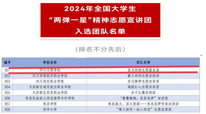 4月3日,全国大学生“两弹一星”精神志愿宣讲团入选团队名单公布,我校财经管理学院“星光财韵志愿团”成功入选。