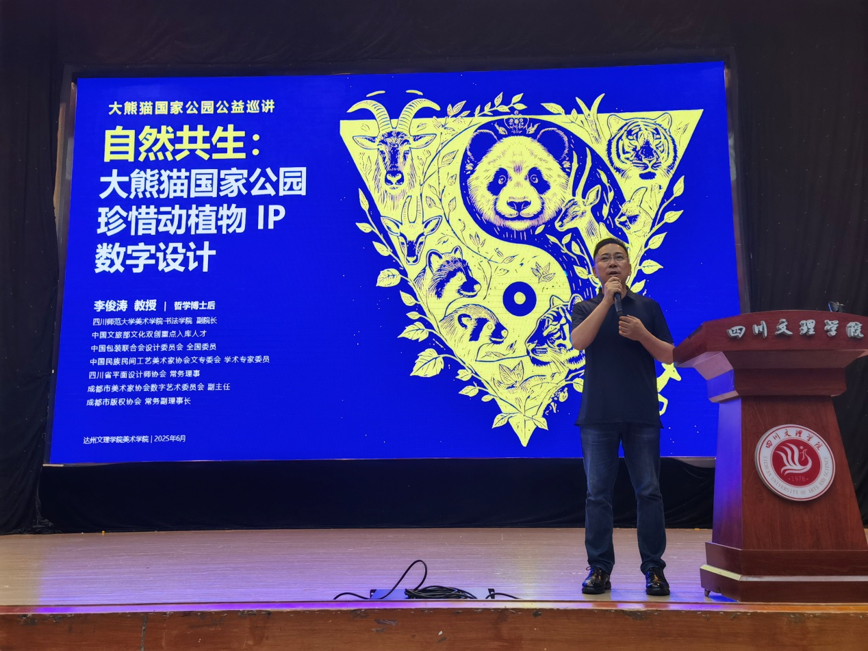 本次公益巡讲聚焦设计与教育探索、文化价值解读、艺术创作、IP转化商业实践四大核心内容。四川师范大学美术学院·书法学院副院长、四川省大熊猫国家公园文化创意创新联盟副主席李俊涛教授围绕“自然共生:大熊猫国家公园珍稀动植物IP数字设计”主题进行演讲。他分享了前沿的AIGC数智化设计形态,结合泡泡玛特等爆款案例和艺术作品,解析如何打破经典风格束缚,探索符合当代年轻人审美的设计表达,展现了艺术在生态IP创新中的活力。