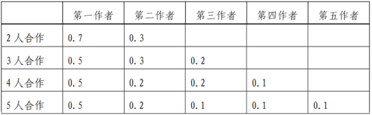 (四)所有合作成果均由负责人或第一作者统一登记在本部门,并标注每人分配比例,可参考以下比例: