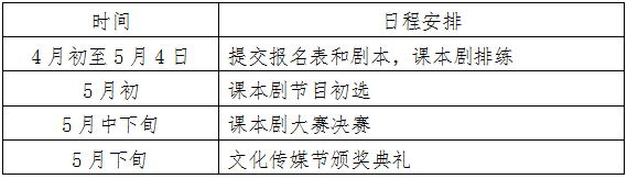 5月4日之前,完成课本剧的创作和排练,参赛团队需认真填写报名表,填好后将纸质报名表交于艺术传媒大楼文学与传播学院1001学生工作办公室,电子档报名表和剧本发送至邮箱:1428735282@qq.com,剧本纸质档交至1001学生工作办公室。