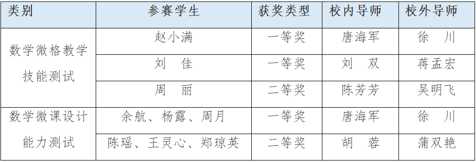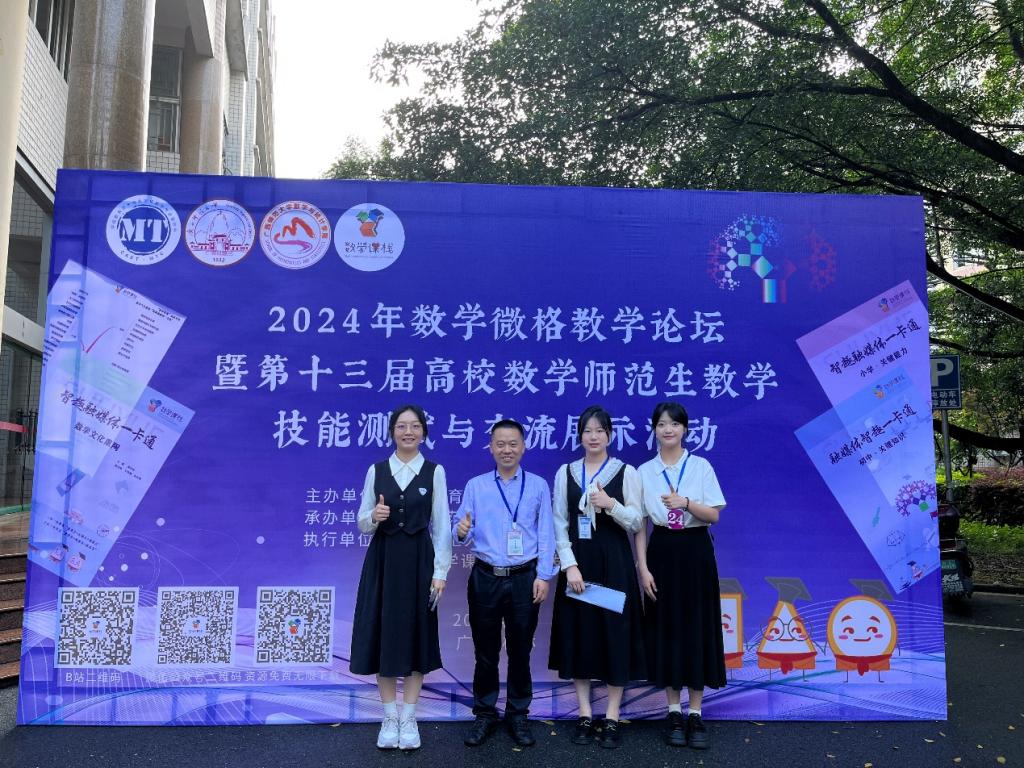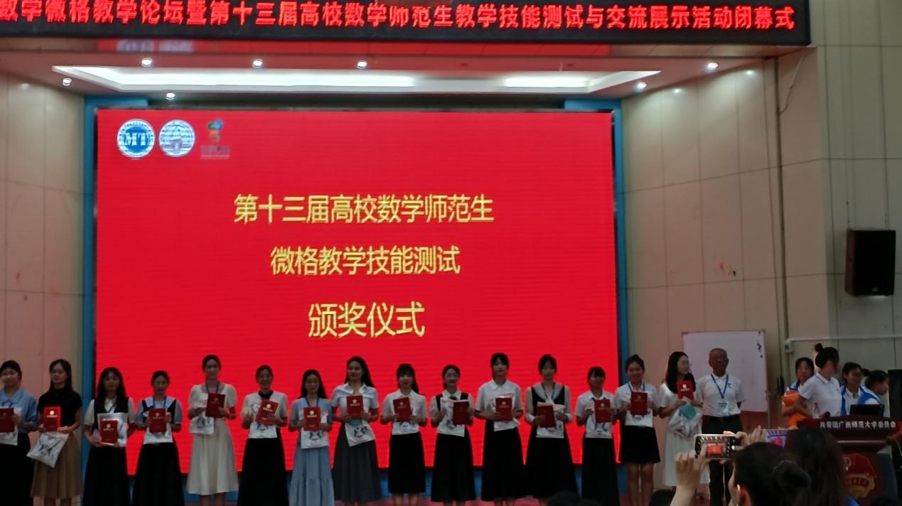 5月17日至20日,2024年数学微格教学论坛暨第十三届高校数学师范生教学技能竞赛与交流展示活动在广西师范大学落下帷幕,本次大赛由中国教育技术协会微格教学专业委员会主办、广西师范大学数学与统计学院承办,来自华中师范大学、陕西师范大学、西南大学、四川师范大学等在内的90所院校1611名选手参加比赛。我校数学学院学生通过初赛、决赛选拔,在数学专业教师和校外兼职导师的协力指导下,在微格教学技能竞赛中,荣获一等奖2项,二等奖1项;在微课设计能力测试中,荣获一等奖1项,二等奖1项。yl23455永利集团官网数学学院荣获优秀组织单位称号。