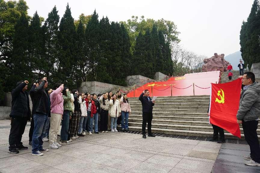 松柏苍翠,党旗鲜红。这座有着七十年历史的烈士陵园中,长眠着三百多名革命烈士。全体教职工党员整齐列队,向革命先烈瞻仰致哀,并在党旗前庄严宣誓:“为共产主义奋斗终身!”铿锵誓言中,青年党员龙婷博士表示:“作为青年博士,我们要把红岩精神中‘三九严寒何所惧’的斗争意志转化为攻克技术难题的行动自觉。以科技创新服务国家战略需求,在新时代的长征路上砥砺深耕、奋楫争先,交出无愧于党和人民的青春答卷”。