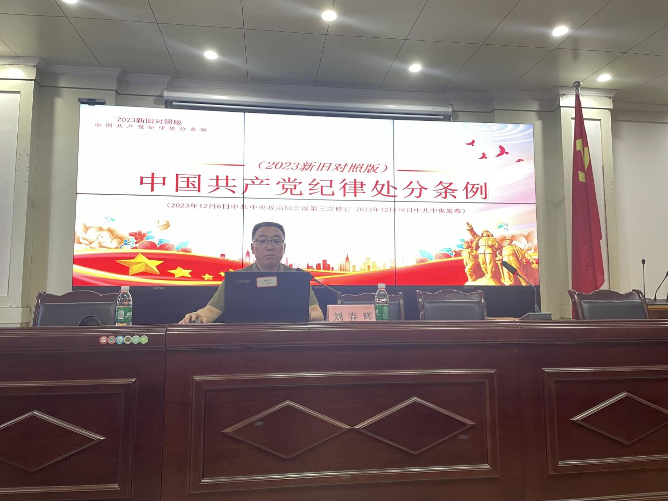 刘春辉教授以“心存戒尺行有所止——学纪、知纪、明纪、守纪”为主题,以遵守纪律可以增长智慧的趣味故事“打手心”为开场,围绕党纪学习的“开展时间、重要意义、开展目的、目标要求、学习重点、工作要求”六个方面,利用史料、案例及对国内外、党内政治形势的分析,详细论述了无产阶级政党纪律建设的脉络和新时期中国共产党加强纪律建设的重要性和迫切性。他讲到,我们中国共产党是靠革命理想和铁的纪律组织起来的马克思主义政党,纪律严明是党的光荣传统和独特优势,也是党的力量所在;纪律是执行路线保证,要让铁纪“长牙”发威,让干部重视、警醒、知止。最后参会人员共同学习了《中国共产党纪律处分条例》(2023新旧对照版)。